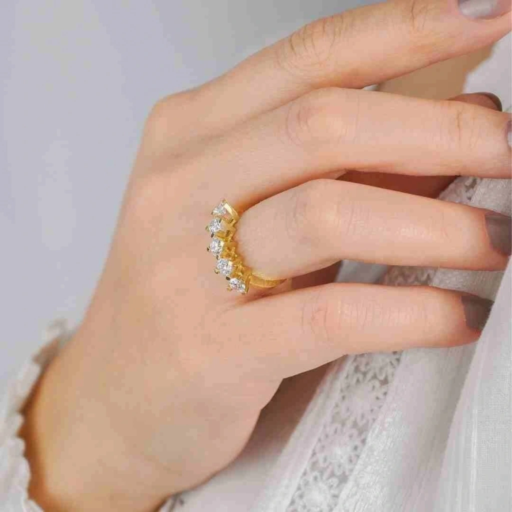 Evla Kuyumculuk’un 14 Ayar Altın Beştaş Yüzük modeli, özenle tasarlanmış ve dikkatle üretilmiştir. İşte bu muhteşem yüzüğün bazı özellikleri:
