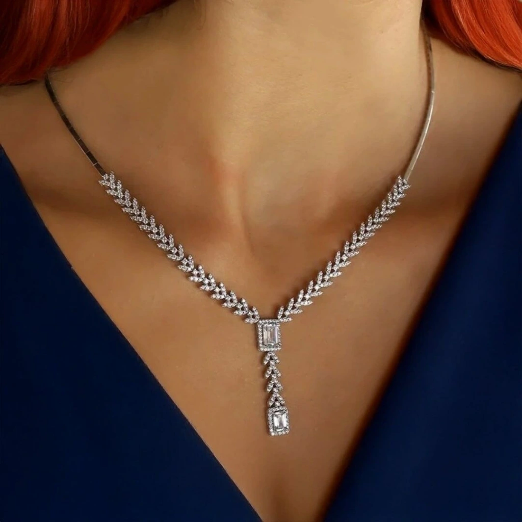 Kolye ve küpe üzerinde Swarowski taşlar bulunmaktadır.