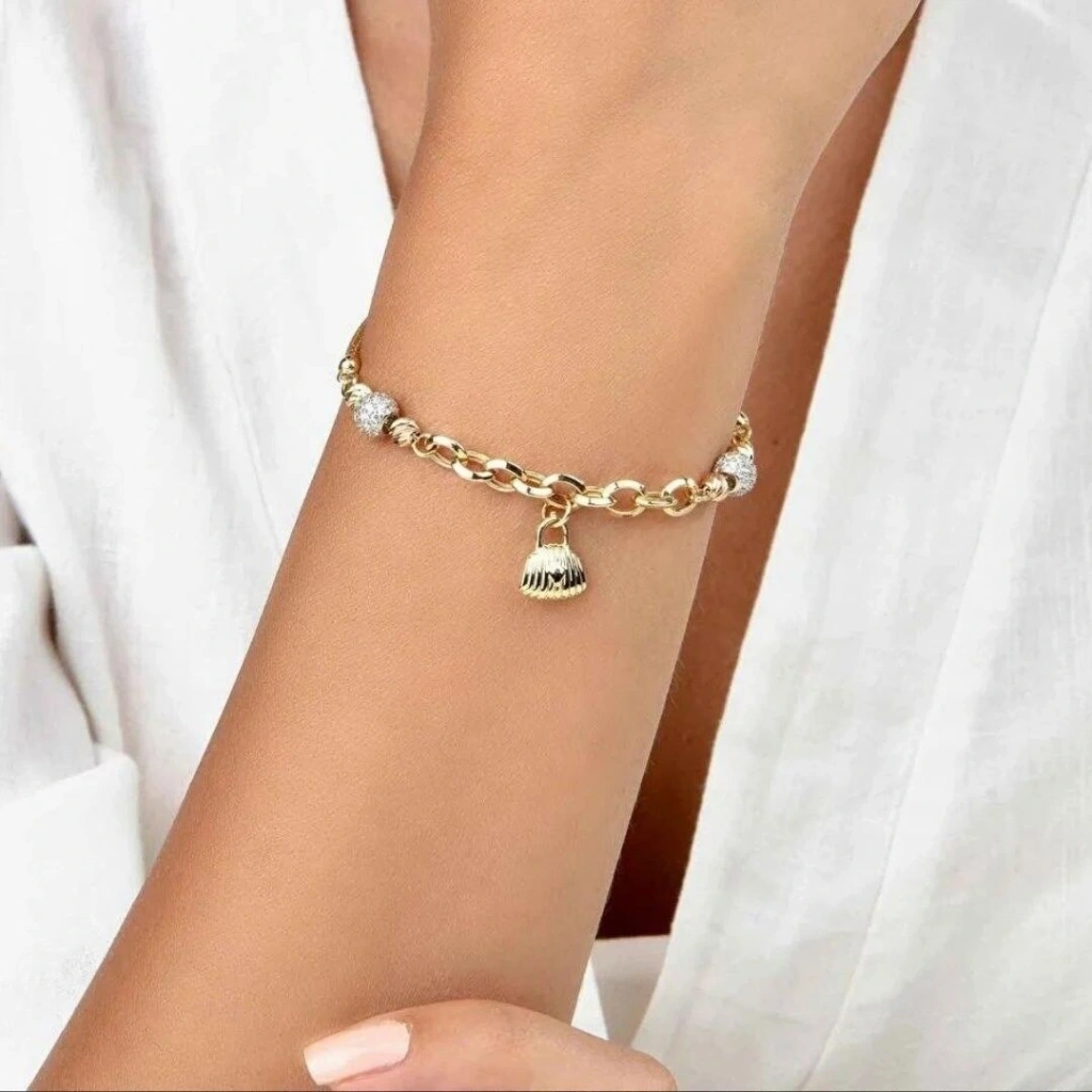 Evla Kuyumculuk'un 14 Ayar Altın Çanta Bileklik ürünü, şıklık ve zarafeti bir araya getiren özel bir mücevherdir. Bu bileklik, yüksek kaliteli 14 ayar altın malzemeden üretilmiştir ve 5,85 gram ağırlığındadır. Altın tasarımının etkileyici özelliklerini taşıyan bu bileklik, çanta motifini zarif bir şekilde yansıtır. Bilekliğin her bir halkası, detaylı ve özenle işlenmiştir . Çanta figürünü temsil eder. Bu dikkat çekici tasarım, bileğinizde göz alıcı bir görünüm yaratır.
