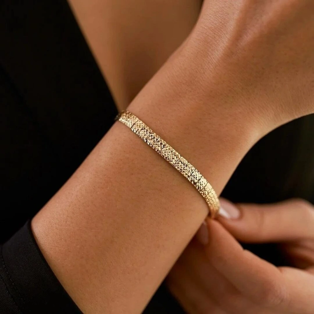 Bileklik, 19 cm uzunluğundadır ve desenli zincir şeklindedir.