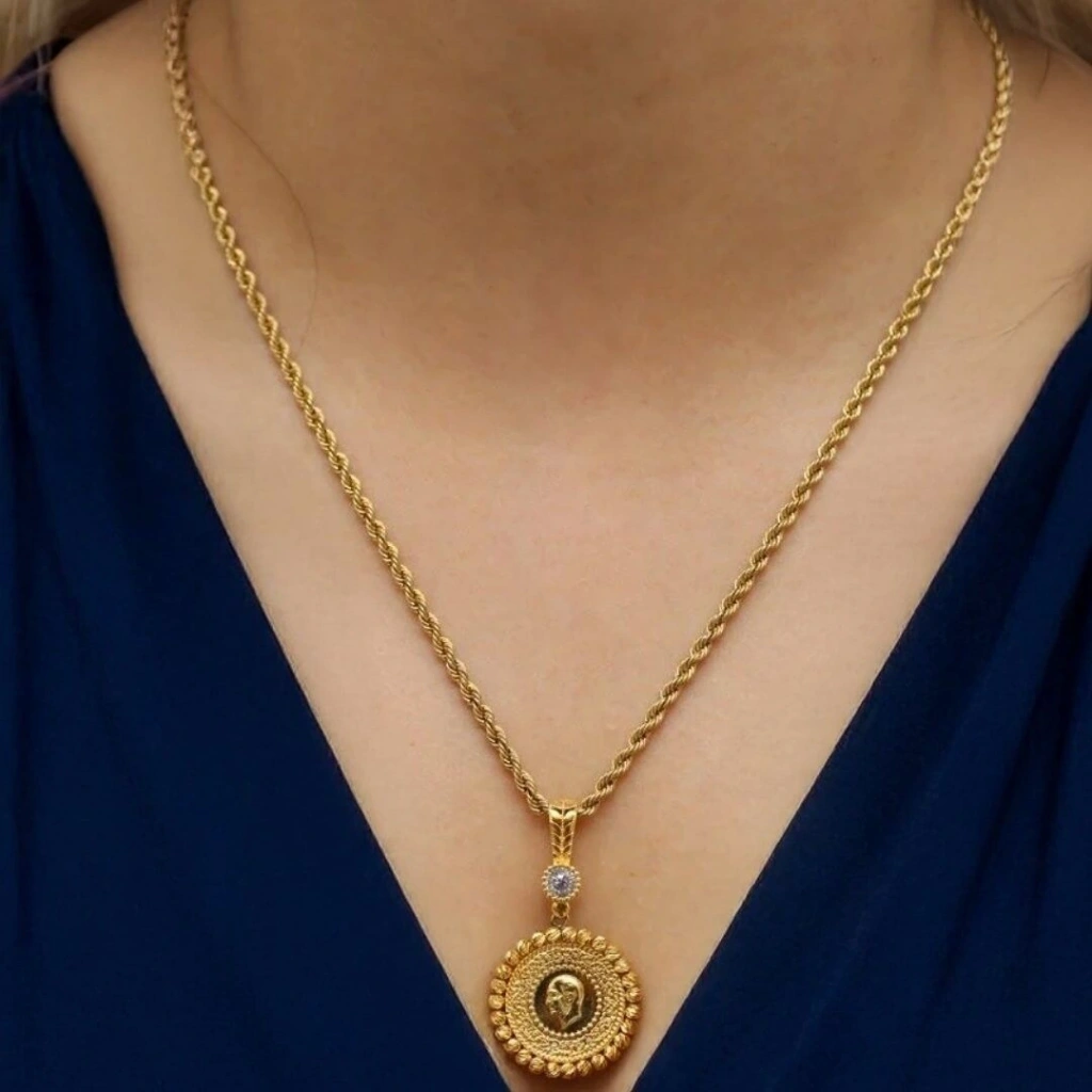 Üzerindeki çeyrek altın uygun fiyatlı gelmesi açısından baskı olarak üretilmiştir .14 ayar altındır .14 Ayar Altın Dorika Baskı Çeyrek Altın Kolye, zarif dorika baskı tekniği ile işlenmiş olup, çeyrek altın tasarımıyla sofistike bir görünüm sunar. Kolye, hem günlük kıyafetler hem de özel etkinliklerde kullanabileceğiniz modern ve şık bir aksesuardır. Kaliteli işçiliği ve dikkat çekici tasarımıyla, uzun yıllar boyunca tarzınızı tamamlar.
