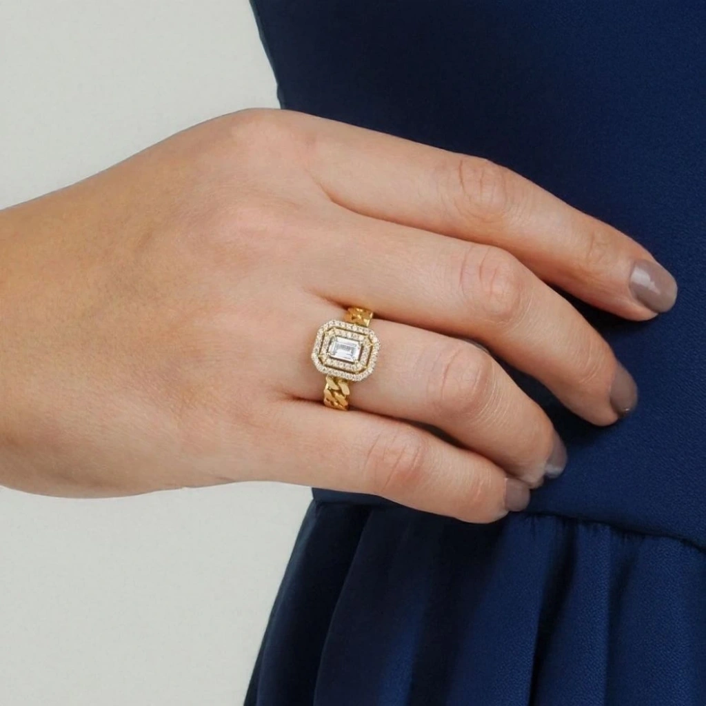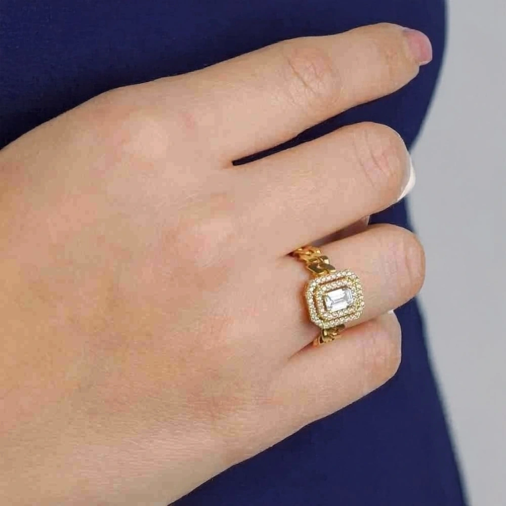 14 Ayar Altın Gurmet Baget Yüzük, şıklığı ve zarafetiyle öne çıkan zarif bir takıdır. 4,19 gram ağırlığında olan bu yüzük, modern baget kesim tasarımı ile her tarzı tamamlayacak mükemmel bir parça sunuyor. Sarı altının sıcaklığıyla tasarlanmış olup, kullanıcısına zarif ve dikkat çekici bir görünüm kazandırır.