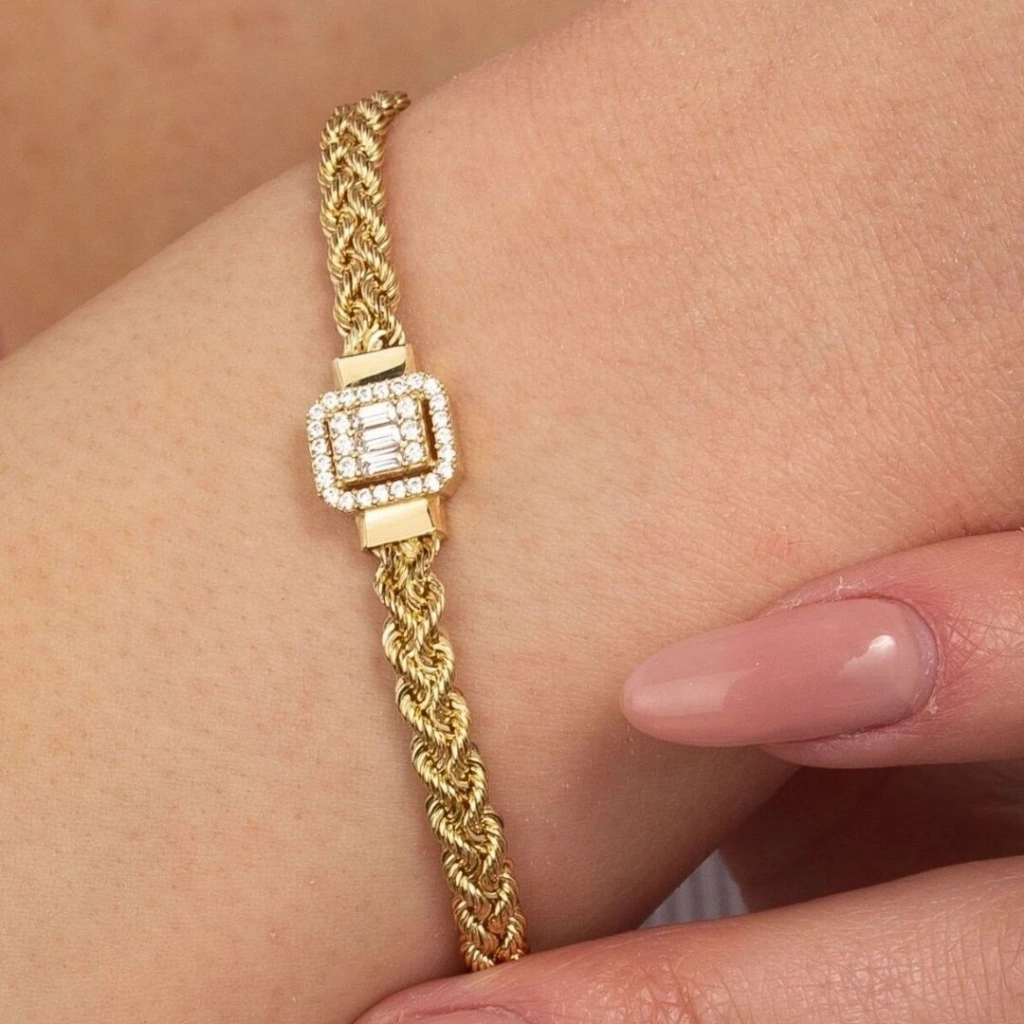 14 Ayar Altın Halat Zincir Baget Bileklik, 5,47 gram ağırlığında olup, şık ve zarif tasarımıyla dikkat çeker. Halat zincir modeli, bilekliğe klasik ve zamansız bir hava katarken, baget taş detayları ise modern bir ışıltı sunar.
