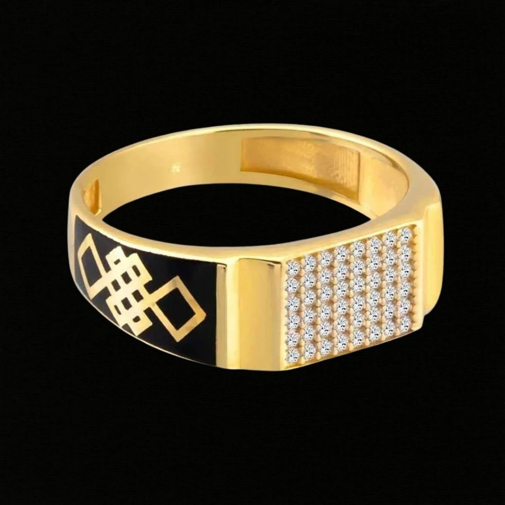 Yüzüğün ön yüzünde bir İşleme Mineli Taşlı Erkek Yüzüğü figürü bulunmaktadır. Bu tasarım, yüzüğü şık ve zarif bir görünüm kazandırmaktadır. İşleme Mineli Taşlı Erkek Yüzüğü figürü, şans ve umut anlamını taşıdığına inanılan bir semboldür.