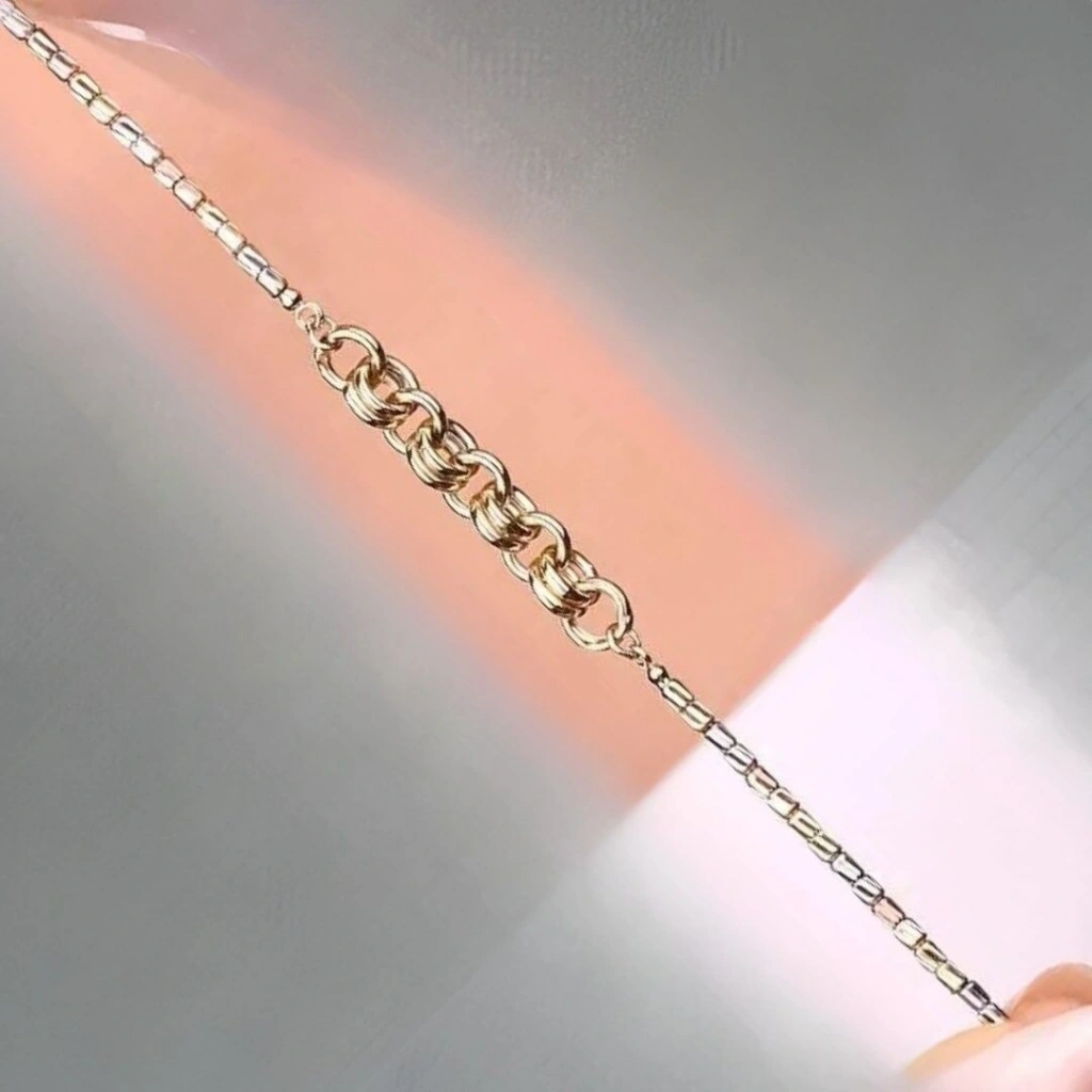 Sarı altın rengiyle dikkat çekerken, dorika boncukları bilekliğe sofistike bir ışıltı katmaktadır.