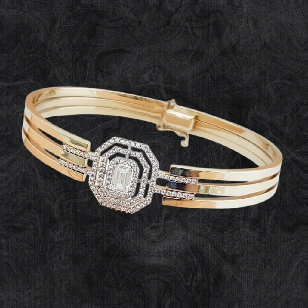 Kelepcenin dış kısmı kaburga deseniyle kaplıdır. Kaburga deseni, zarif ve şık bir görünüm sunar. Kelepcenin iç kısmı ise baget kesimli taşlarla süslenmiştir. Baget kesimli taşlar, kelepceye ışıltı ve zarafet katmaktadır.