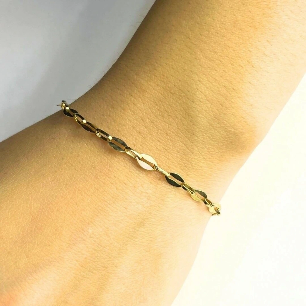 14 ayar altın kilit zincir bileklik, ince tasarımıyla her gün kullanıma uygun olduğu gibi, özel davetlerde de göz alıcı bir aksesuar olarak öne çıkar. Modern ve minimal tarzıyla sade bir şıklık sunar.