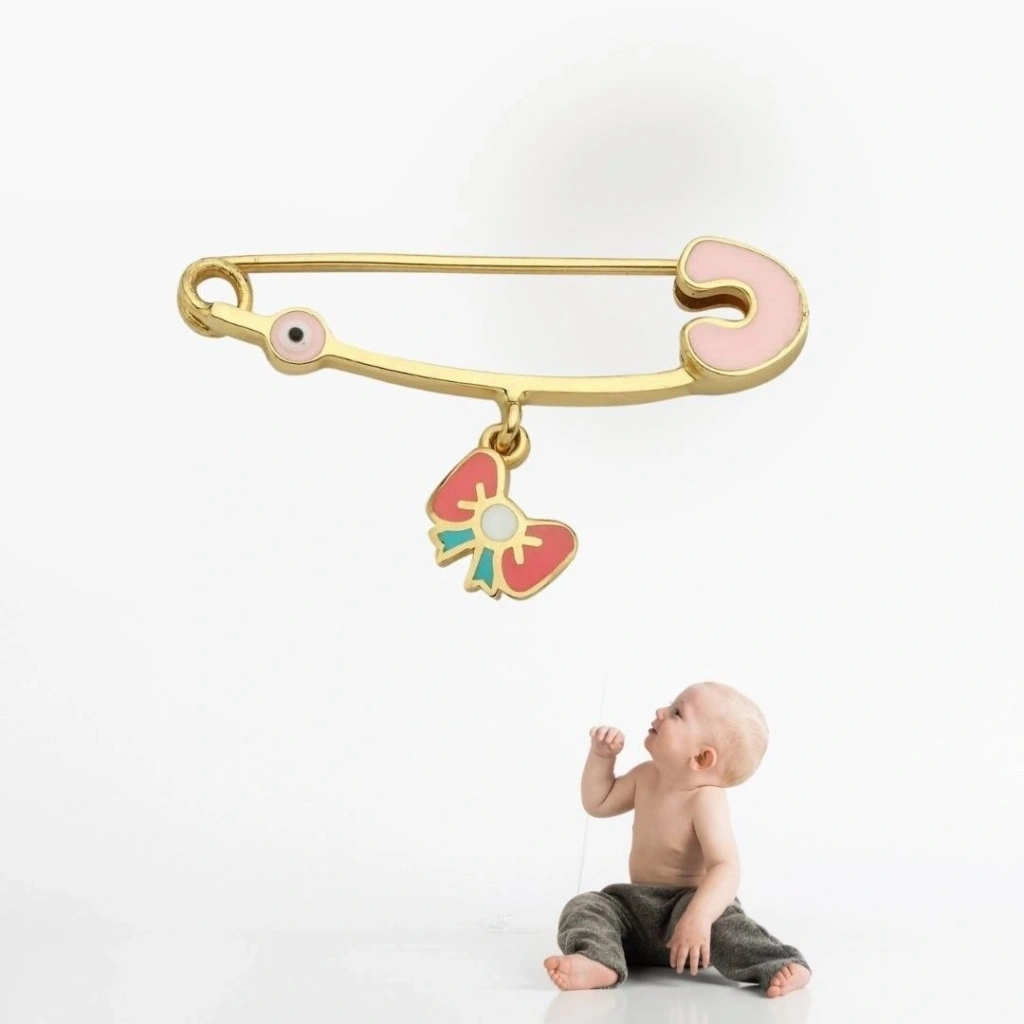 14 Ayar Altın Kurdela Bebek İğnesi 1,10 Gram : Bu 14 Ayar Altın Bebek İğnesi, Evla Kuyumculuk tarafından özenle tasarlanmış ve üretilmiş bir mücevherat ürünüdür. Yüksek kaliteli malzemeler ve özenli işçilikle yapılan bu bebek iğnesi, zarif ve sevimli bir görünüme sahiptir.Bebek iğnesinin yapımında 14 ayar altın kullanılmış olup, toplamda 1,10 gram ağırlığındadır. İnce ve narin tasarımıyla bebeklerin giysilerine zarar vermeden kullanılabilecek şekilde üretilmiştir. Altın rengi, iğneye değerli ve şık bir hava katarken, zarif detayları bebek iğnesine özel bir zarafet kazandırır.