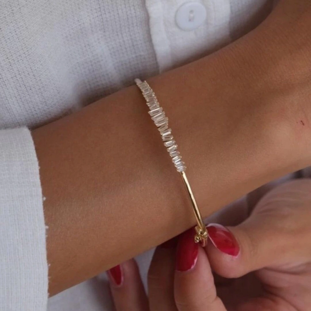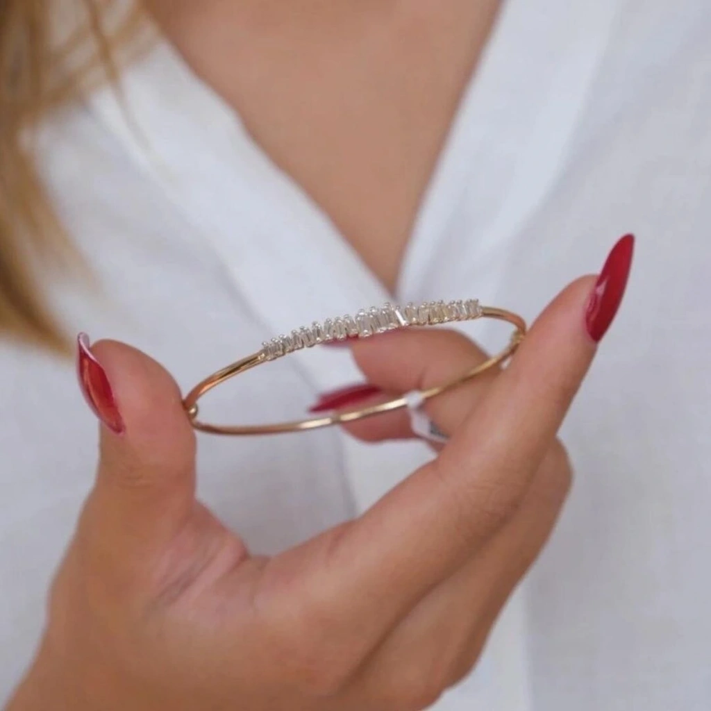 Evla Kuyumculuk'un 14 Ayar Altın Mini Baget Kelepçe ürünü, zarifliği ve şıklığı bir arada sunan özel bir mücevherdir. Bu kelepçe, yüksek kaliteli 14 ayar altın malzeme kullanılarak üretilmiştir ve 5,26 gram ağırlığındadır. Mini Baget tasarımıyla öne çıkan bu kelepçe, ince ve uzun baget şeklindeki detaylarıyla dikkat çeker. Zarif çizgileri ve parlak yüzeyi, kelepçeye zarafet katarken aynı zamanda tarzınıza sofistike bir dokunuş sağlar.