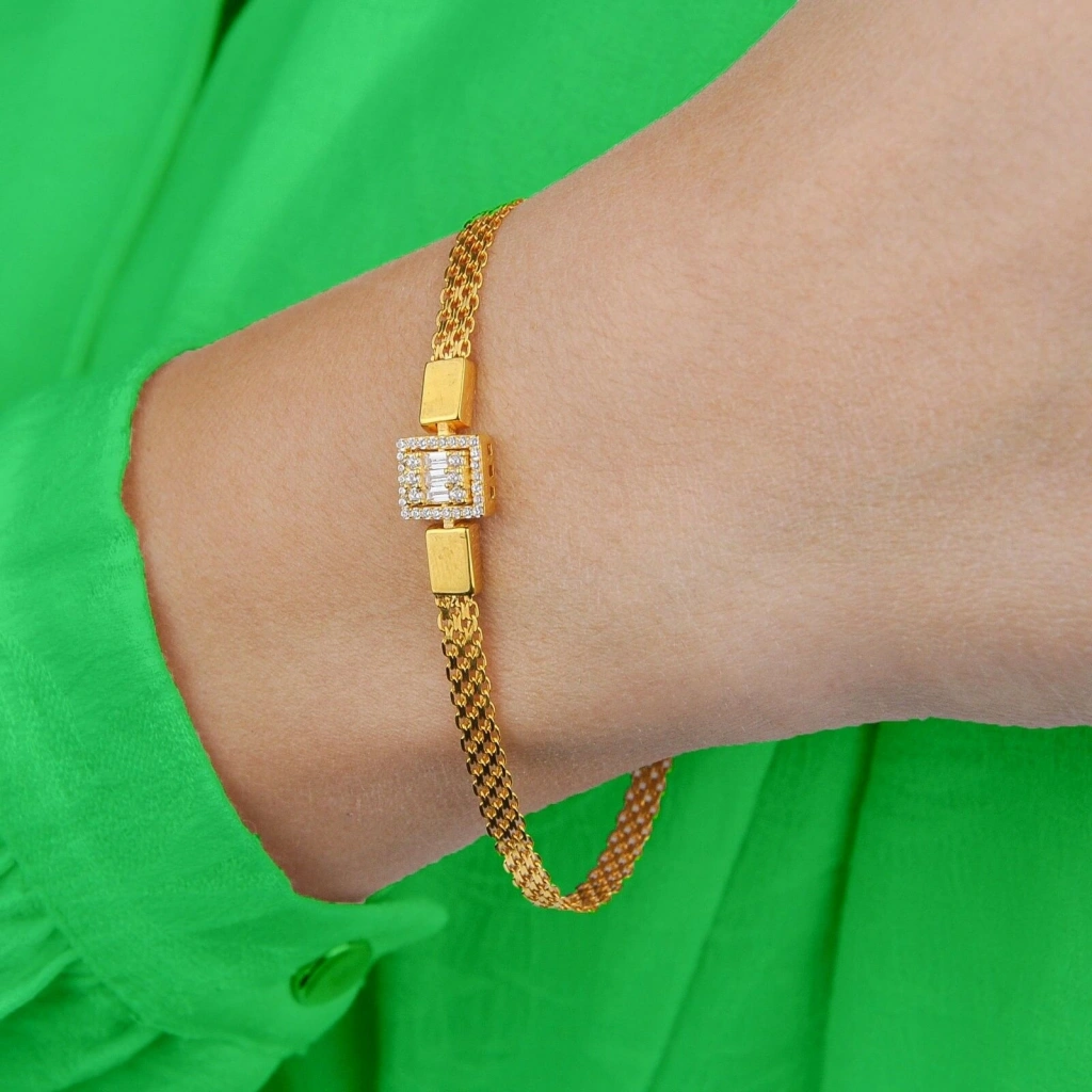 Örme, birbirine geçirilmiş halkalardan oluşan bir tasarım türüdür. Örme bileklikler, şık ve zarif görünümleriyle her kombine uyum sağlar. Evla Kuyumculuk’un 14 ayar altın örme baget bilekliği, örme tasarımını baget kesim taşlarla birleştirerek hem şık hem de modern bir görünüm sunuyor.