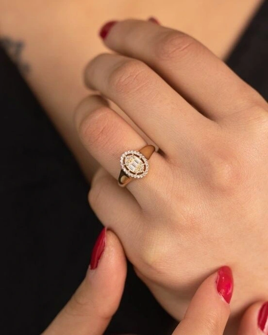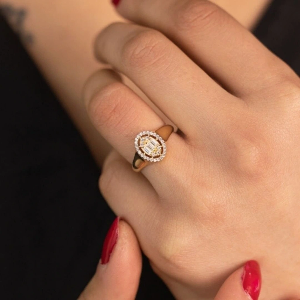 14 Ayar Altın Oval Baget Yüzük 2,35 gram; Evla Kuyumculuk, zarafeti ve şıklığı bir araya getiren benzersiz tasarımlarından biri olan 14 Ayar Altın Oval Baget Yüzük ile sizlere özel bir takı deneyimi sunuyor. Bu yüzük, 14 ayar altından üretilmiş olup, toplamda yaklaşık 2,35 gram ağırlığındadır.Yüzük, oval şekilli tasarımıyla öne çıkar ve altın baget kesim taşlarla zenginleştirilmiştir. Baget kesim taşların zarif hatları, yüzüğe modern bir dokunuş katarak ışıltılı bir görünüm sağlar. Bu zarif yüzük, parmağınızda göz alıcı bir vurgu yaparak tarzınızı ön plana çıkarır.