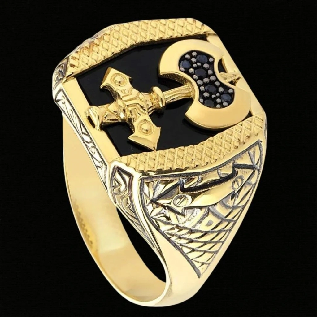 Yüzüğün ön yüzü, kılıç şeklini andıran özgün bir tasarıma sahiptir. Kılıcın kabzası ve bıçağı, detaylı bir şekilde işlenmiştir. Kabza kısmı, pürüzsüz ve parlak bir yüzeye sahiptir. Bıçak kısmı ise, mat bir yüzeye sahiptir ve üzerinde zarif oyma motifleri yer almaktadır. Yüzüğün yanları ve iç kısmı pürüzsüz bir şekilde cilalanmıştır. Bu da yüzüğü takmayı oldukça konforlu hale getirir.