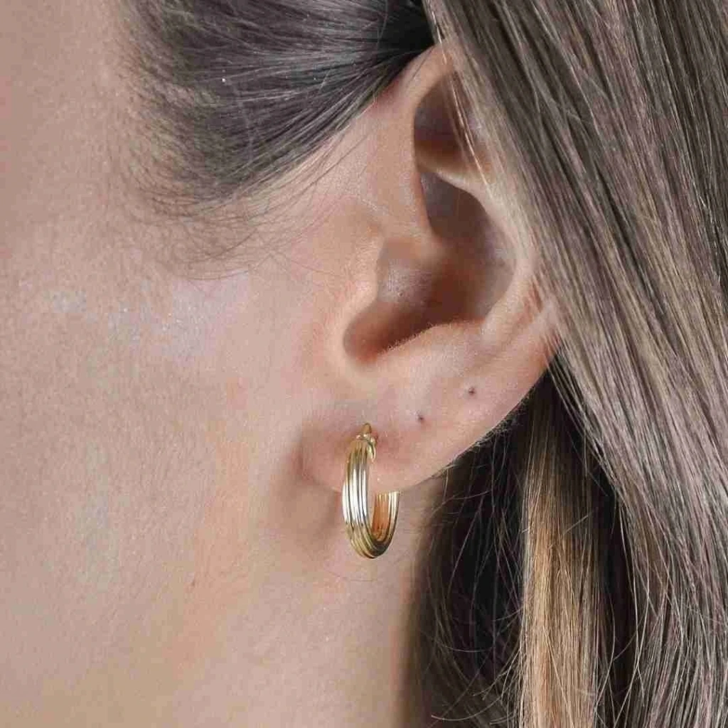 Küpenin şeritleri, ona şık ve modern bir görünüm kazandırıyor. Küpenin halka formu, ona klasik ve zamansız bir hava katıyor.