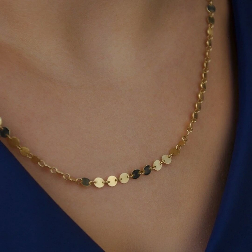 14 Ayar Altın Sık Pullu Zincir, ince ve sık dokusu ile göz alıcı bir koruyanya sahip klasik bir aksesuardır. Özel pullu tasarım, sade zincirlere göre daha dikkat çekici bir durma sergiler. 50 cm uzunluğuyla hem günlük kullanım hem de özel gün kombinlerinize şıklık katar. Zarif tasarımı sayesinde tek başına kullanılabilir ya da diğer takılarla kombinlenebilir.