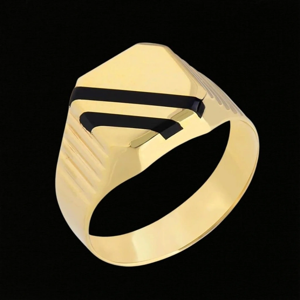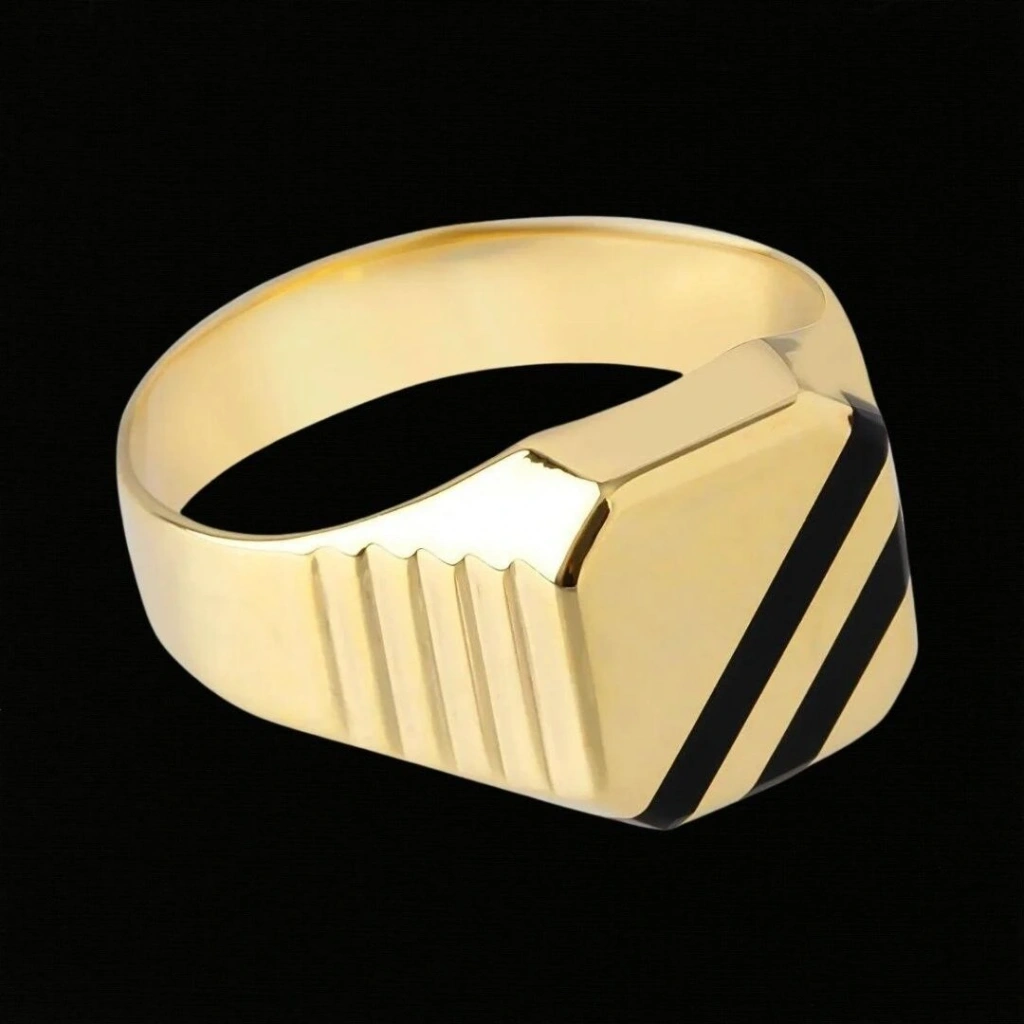 Bu 14 Ayar Altın Siyah Çiftli Mineli Erkek Yüzüğü, Evla Kuyumculuk tarafından özenle tasarlanmış ve üretilmiş bir mücevherat ürünüdür. Kaliteli malzemeler ve dikkatli işçilikle yapılan bu yüzük, güçlü ve göz alıcı bir görünüme sahiptir. Yüzüğün yapımında 14 ayar altın kullanılmış olup, toplamda 4,05 gram ağırlığındadır. Yüzüğün tasarımında siyah mühür detayları kullanılarak benzersiz bir estetik yakalanmıştır. Altın rengi ve siyahın kontrastı, yüzüğe modern ve sofistike bir hava katarak dikkat çekici bir görünüm sunar.