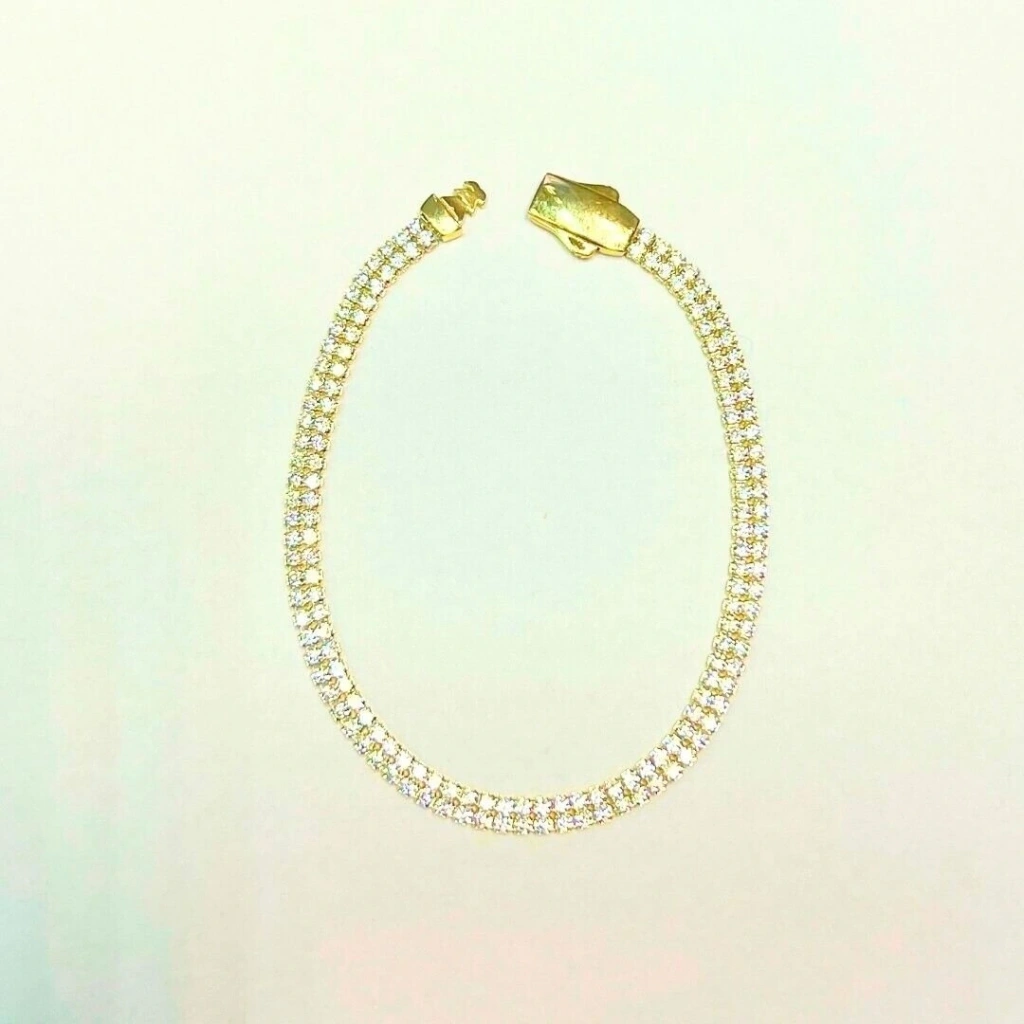 14 ayar altın çift sıra su yolu bileklik,Bileğinize şıklık ve ışıltı katacak modern bir tasarıma sahiptir. Su yolu bilekliklerin klasik dizaynına ek olarak, çift sıra taşlarla daha yoğun bir parlaklık ve lüks bir görünüm sağlar. Bu bileklik, her detayında zarafeti vurgular ve özel günler için mükemmel bir seçimdir.