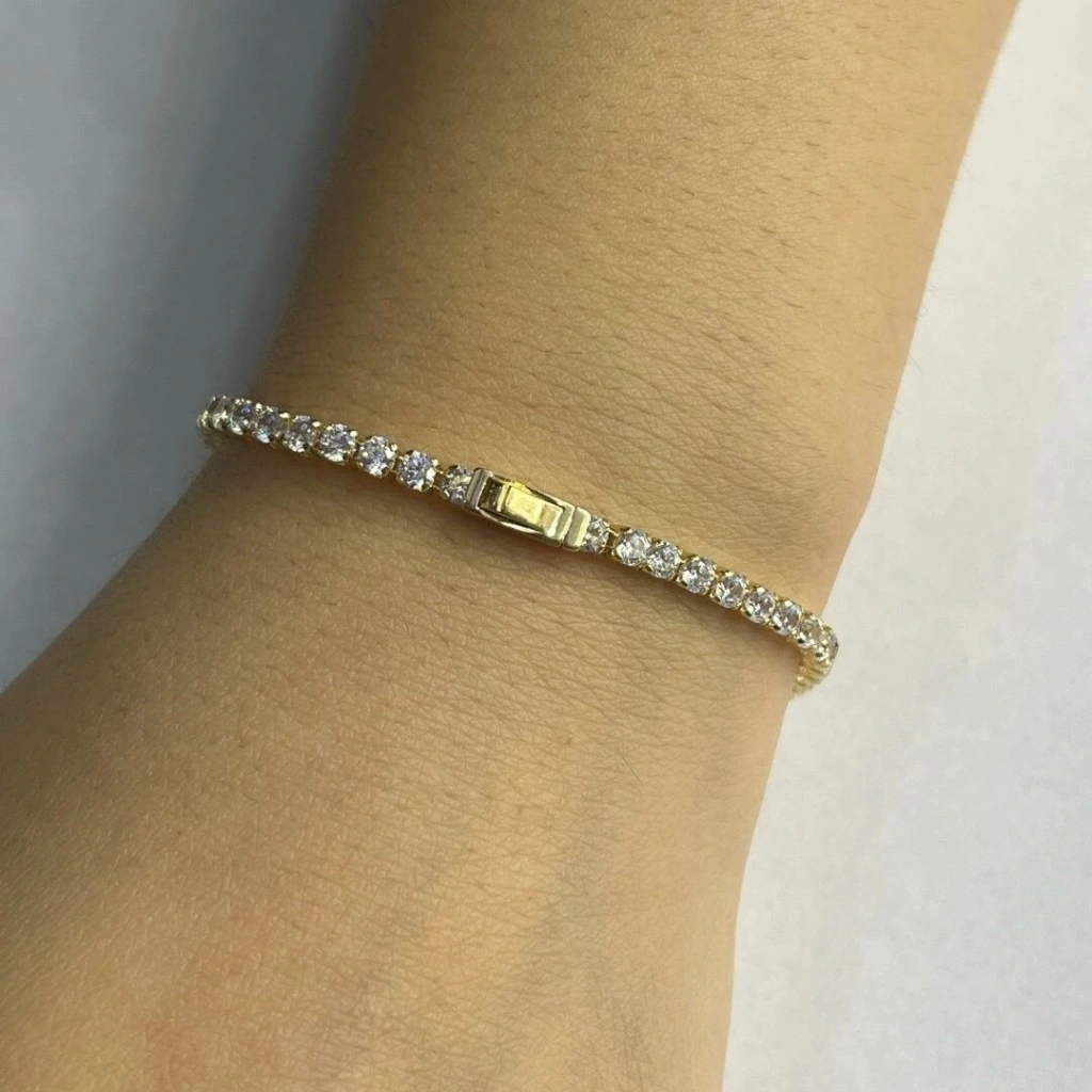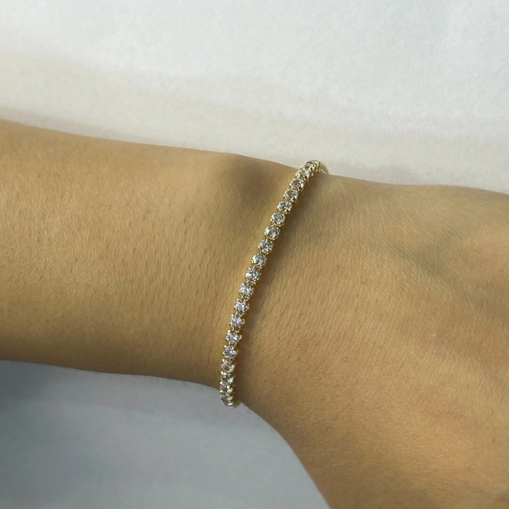 Bu 14 Ayar Altın Su Yolu Bileklik , şıklığı ve zarafeti bir arada sunan, dikkat çekici bir tasarıma sahiptir. 3 mm boyutundaki taşlarla süslenen su yolu dizaynı, bileklik boyunca parlak bir akış efekti oluşturarak her ortamda göz alıcı bir görünüm sunar.