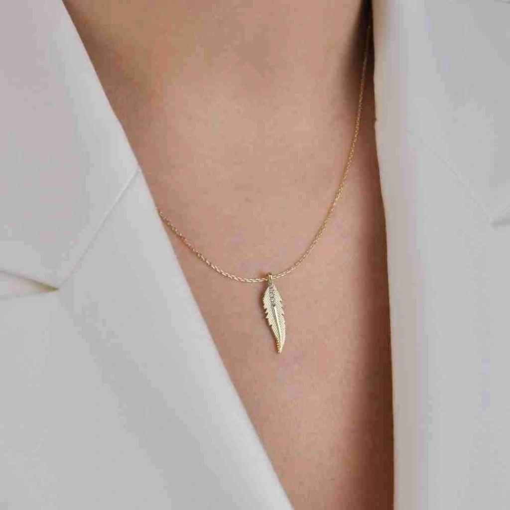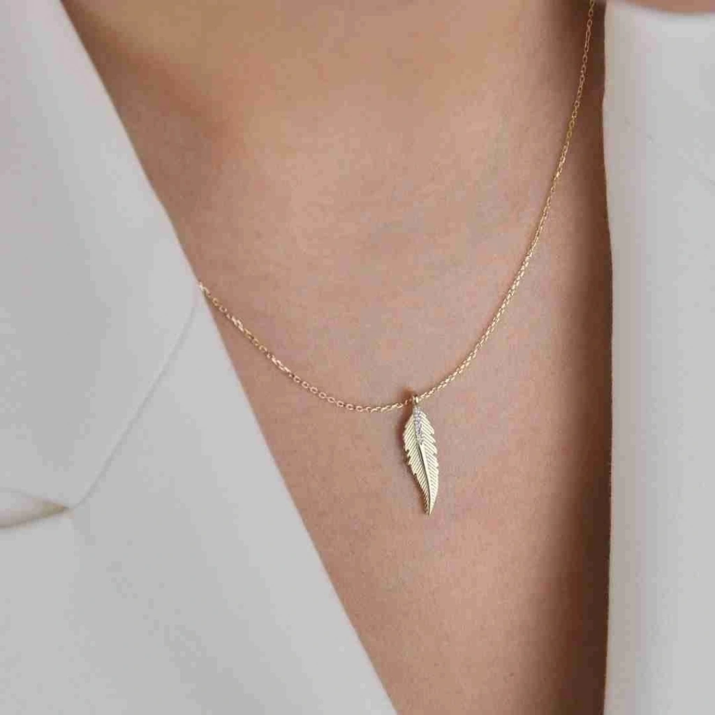 Kolyenin tüy motifli tasarımı, hafiflik ve özgürlük hissi verirken, altının parlaklığı da dikkat çekici bir şekilde öne çıkar. Evla Kuyumculuk, bu kolyeyi özgün bir stil ile tasarlamış ve her ayrıntısına özen göstermiştir.
