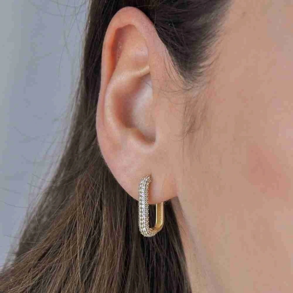Üç sıra taşlı halka modeli ile dikkat çeken küpe, zarif ve ışıltılı bir görünüme sahip. Vidalı kapama özelliğine sahip küpe, kulakta sağlam bir duruş sergiliyor. Günlük kullanıma uygun olan küpe, uzun yıllar kullanabileceğiniz bir aksesuar.
