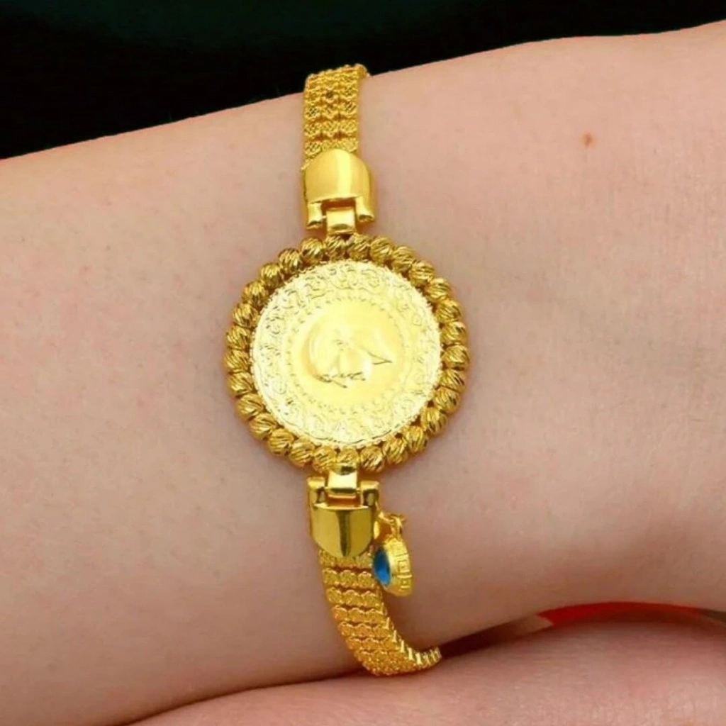 Tasarım: Bileklik tasarımı üç sıralı olarak tasarlanmıştır. Üç sıra altın halka, bilekliğe zengin bir görünüm kazandırır. Detaylı işçilik ve dikkat çekici tasarımıyla bu bileklik, göz alıcı bir aksesuar olarak öne çıkar.