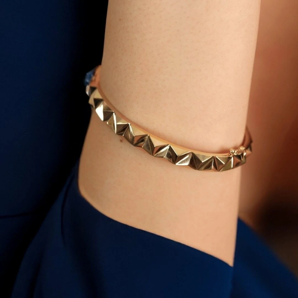 Altın Üçgen Kelepçe, modern geometrik tasarımıyla zarif ve şık bir duruş sergiler. 14 ayar altından üretilmiş bu kelepçe, hem günlük kullanım hem de özel davetler için ideal bir seçenektir.