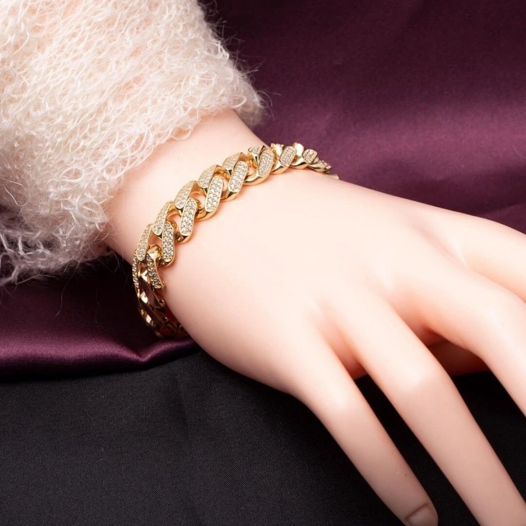 Parlak altın yüzeyi, ışıltılı bir görünüm sunarken, yarım taşlarla süslenmiş ayrıntılar, bilekliğe sofistike bir dokunuş katmaktadır.