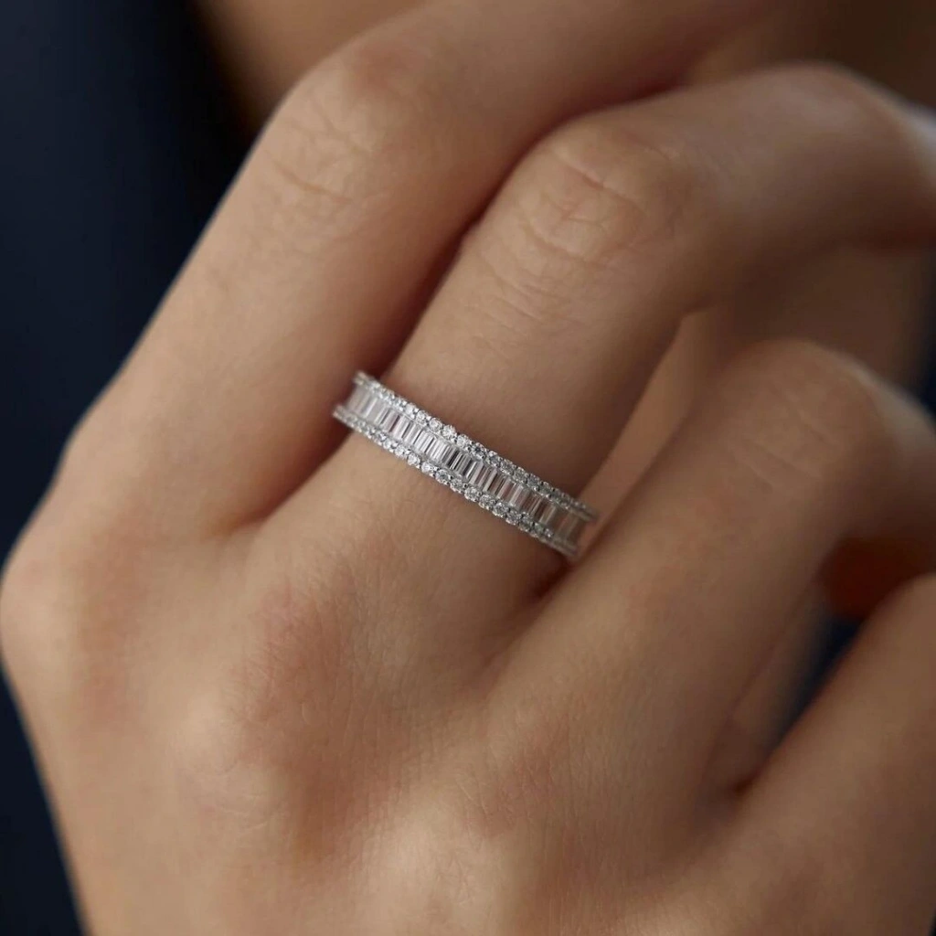 14 Ayar Beyaz Altın Sıra Taşlı Baget Tamtur Yüzük