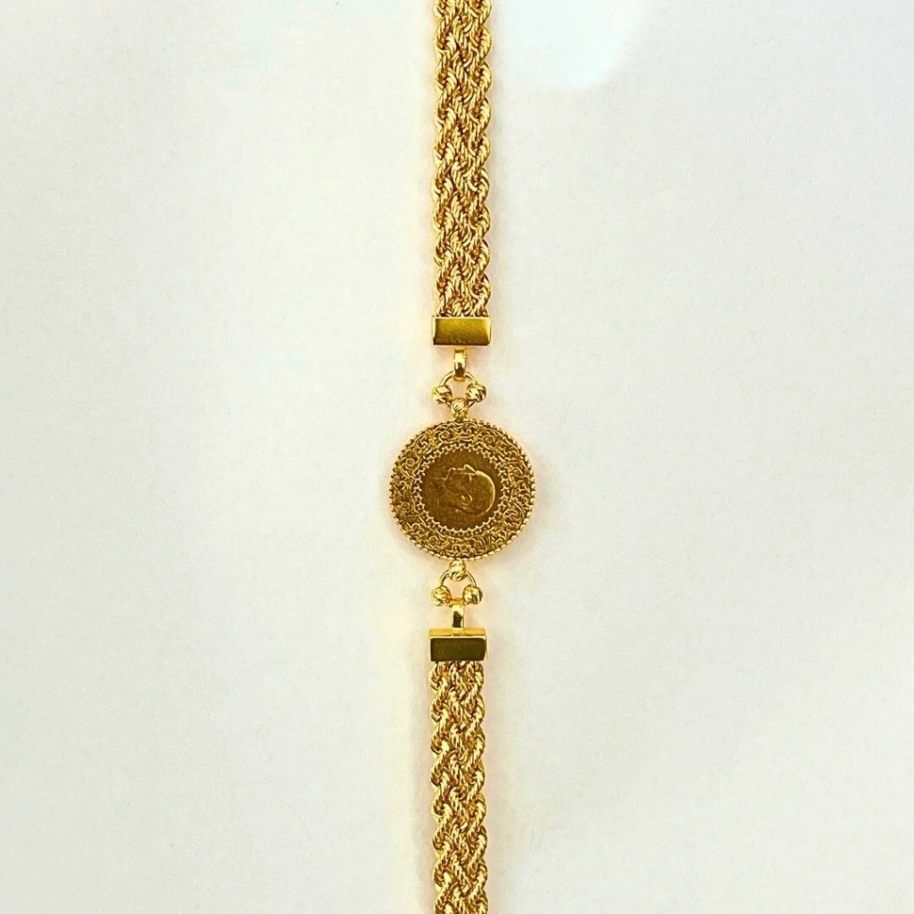 Bu 14 Ayar Halat Çeyrekli Bileklik, klasik tasarımı ve sağlam yapısıyla dikkat çeken, değerli bir takıdır. 8,39 gram ağırlığındaki bu bileklik . Halat tarzındaki örgü deseniyle hem zarif hem de güçlü bir görünüm sunar. Üzerindeki çeyrek altın, bilekliğe hem estetik hem de geleneksel bir değer katar. Halat örgüsü, bileziğin dayanıklılığını artırırken, çeyrek altın bileziğe anlam ve yatırım değeri katar.