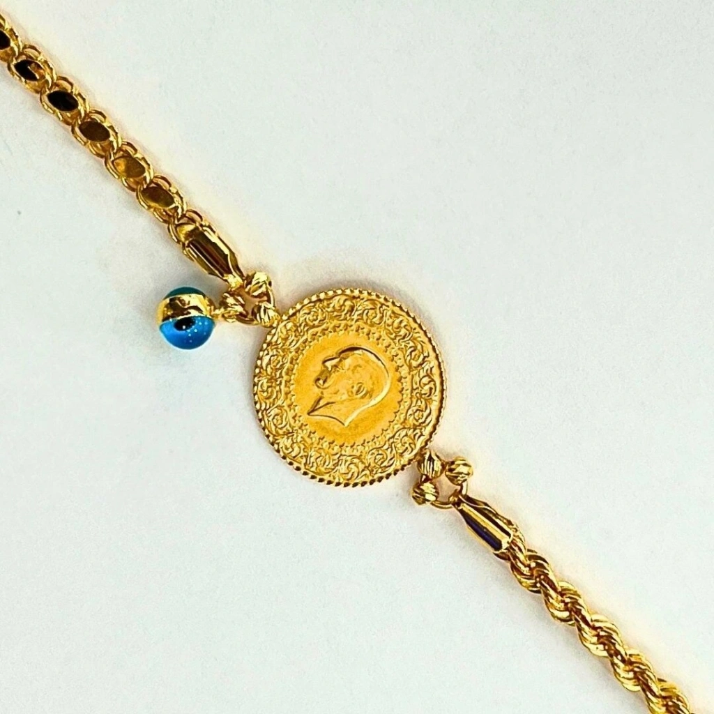 Bu 14 Ayar Pullu Halat Çeyrekli Bileklik, şıklığı ve zarafeti bir araya getiren özel bir tasarımdır. 5,05 gram ağırlığındaki bu bileklik, hem geleneksel hem de modern unsurları barındıran bir yapıya sahiptir. Halat tarzındaki örgü tasarımı, bilekliğe sağlamlık katarken, üzerindeki pullar ve çeyrek altın, bileziğe zarif bir ışıltı ve anlam kazandırır.