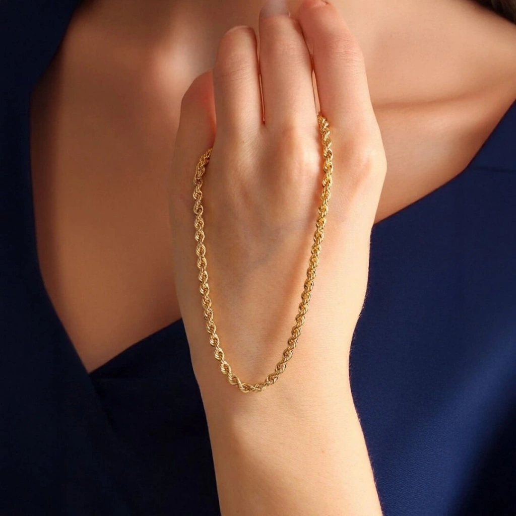 Kaliteli işçiliği ve parlak altın görünümü ile öne çıkan halat zincir kolyemiz, klasik ve modern tarzı bir araya getirerek her stile uyum sağlar. Şıklığınızı tamamlamak için tek başına kullanabileceğiniz gibi, kolye uçlarıyla kombinleyerek de kişisel bir tarz oluşturabilirsiniz.