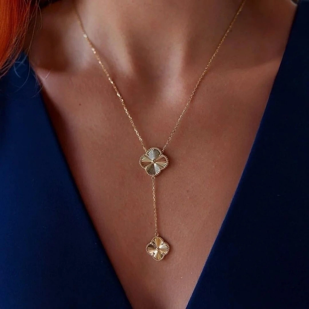 İkili Yonca Tasarımı: Şans ve zarafeti temsil eden yonca detayları, kolyeye benzersiz bir görünüm kazandırır.
