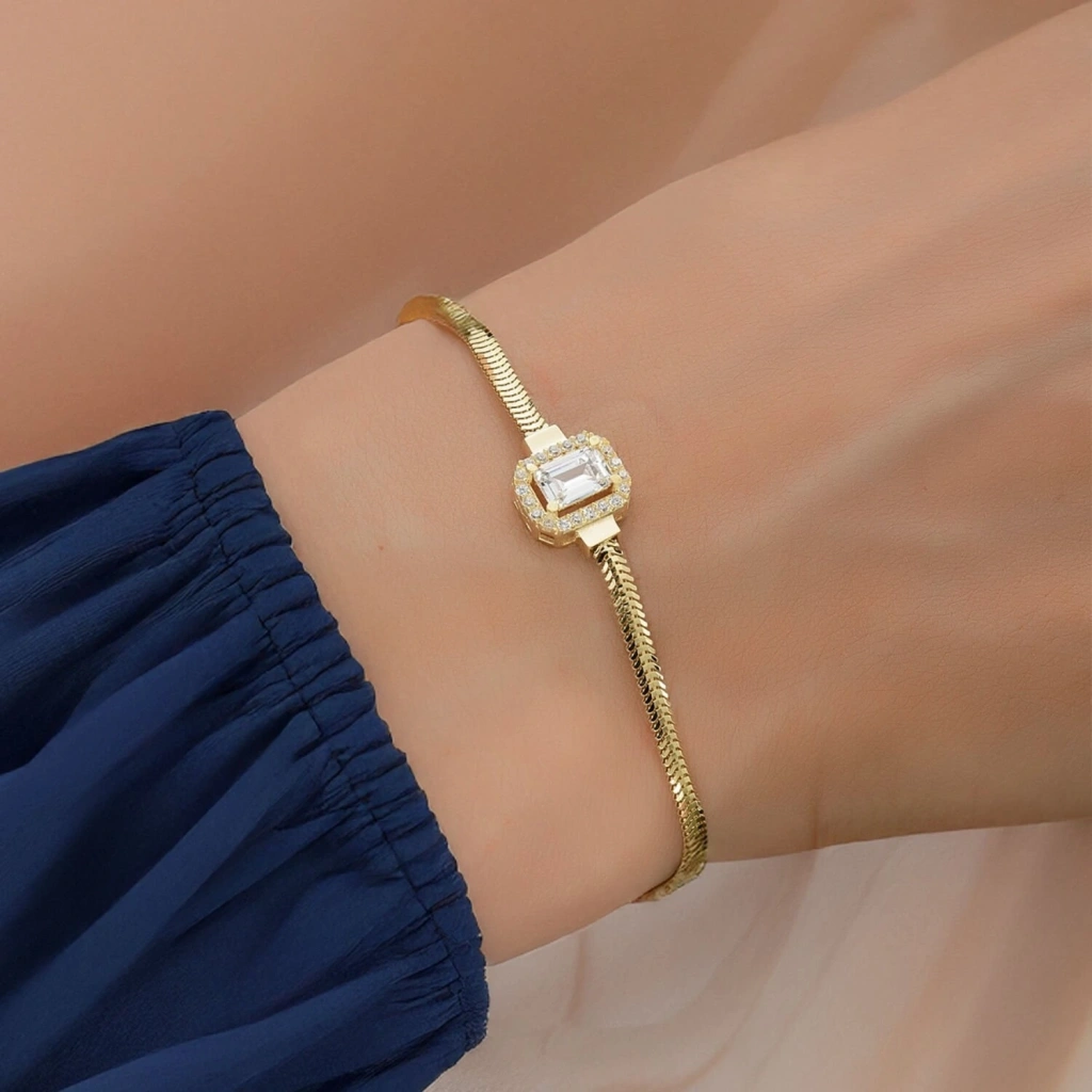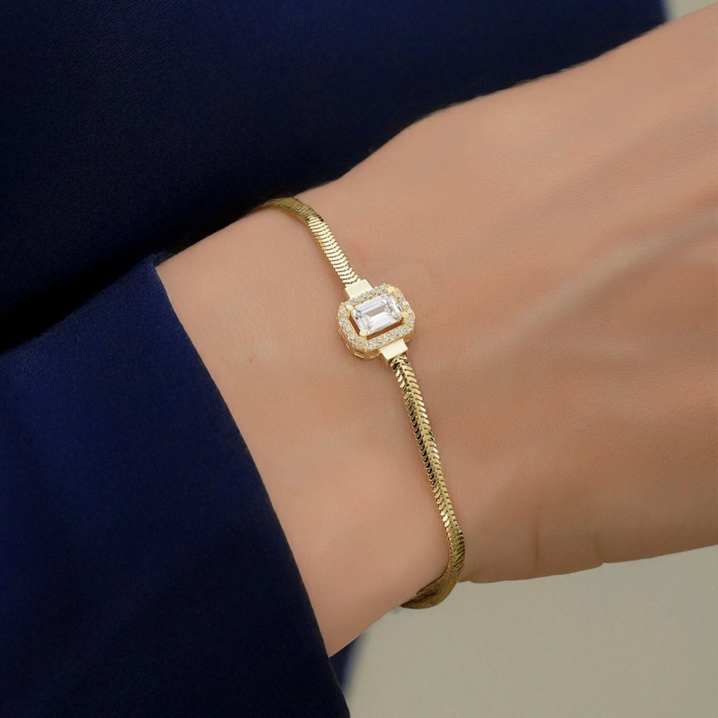 Altın Baget Balıksırtı Bileklik Baget taşlı, balıksırtı desenli 8 ayar altın bileklik. Sertifikalı, 3.6 gr, 18-21 cm uyumlu.