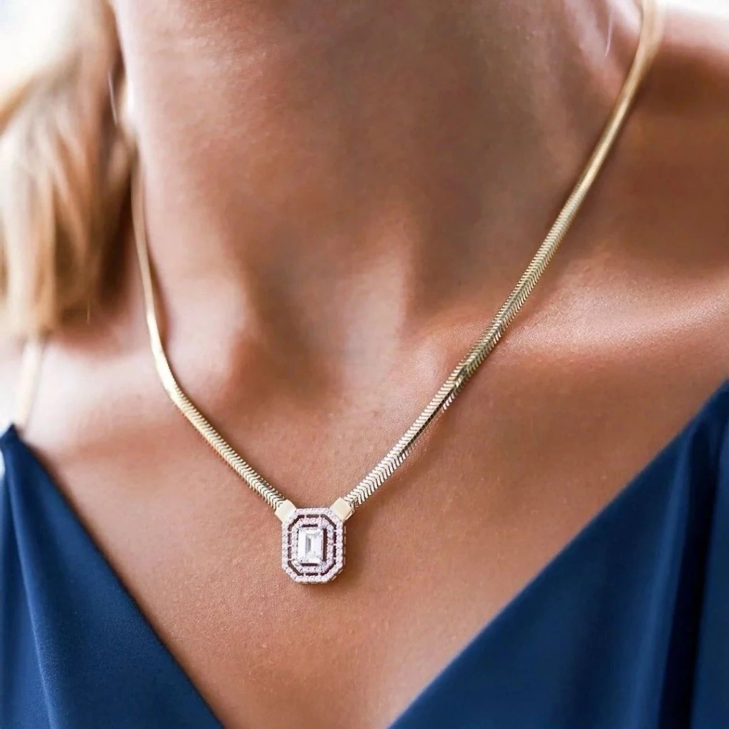 Zarafeti ve modern detayları bir araya getiren 14 Ayar Altın Balık Sırtı Baget Kolye, göz alıcı duruşuyla stilinize değer katıyor.