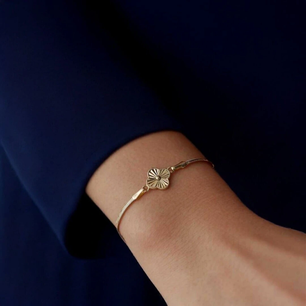 14 Ayar Altın Balıksırtı Yonca Bileklik, zarafeti ve şansı bir arada sunan özel bir takı modelidir.