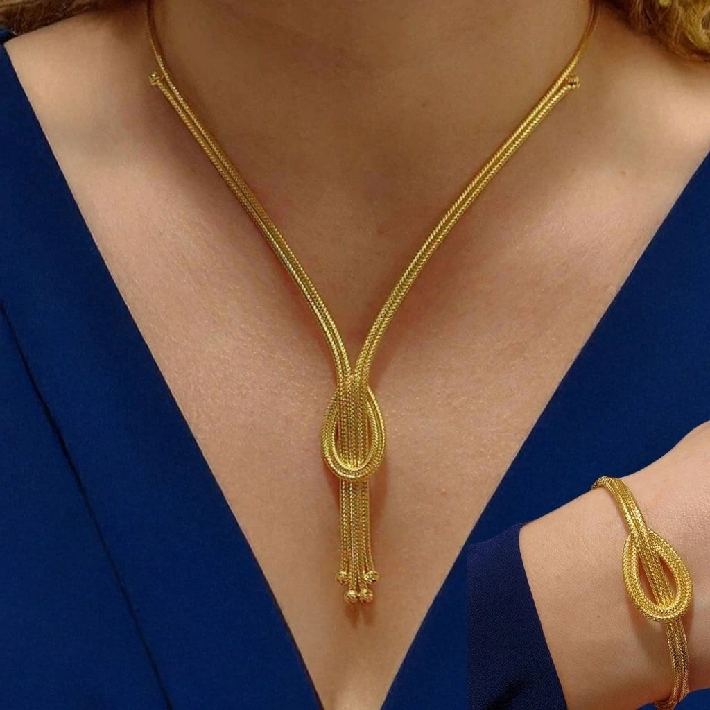 Toplam 10,00 gram ağırlığındaki bu set; 5,00 gr kolye, 2,90 gr bileklik ve 1,10 gr küpeden oluşmaktadır. Sarı altının göz alıcı parlaklığıyla tasarlanan Kalze hasır örgü modeli, modern ve klasik tarzı bir arada sunar.