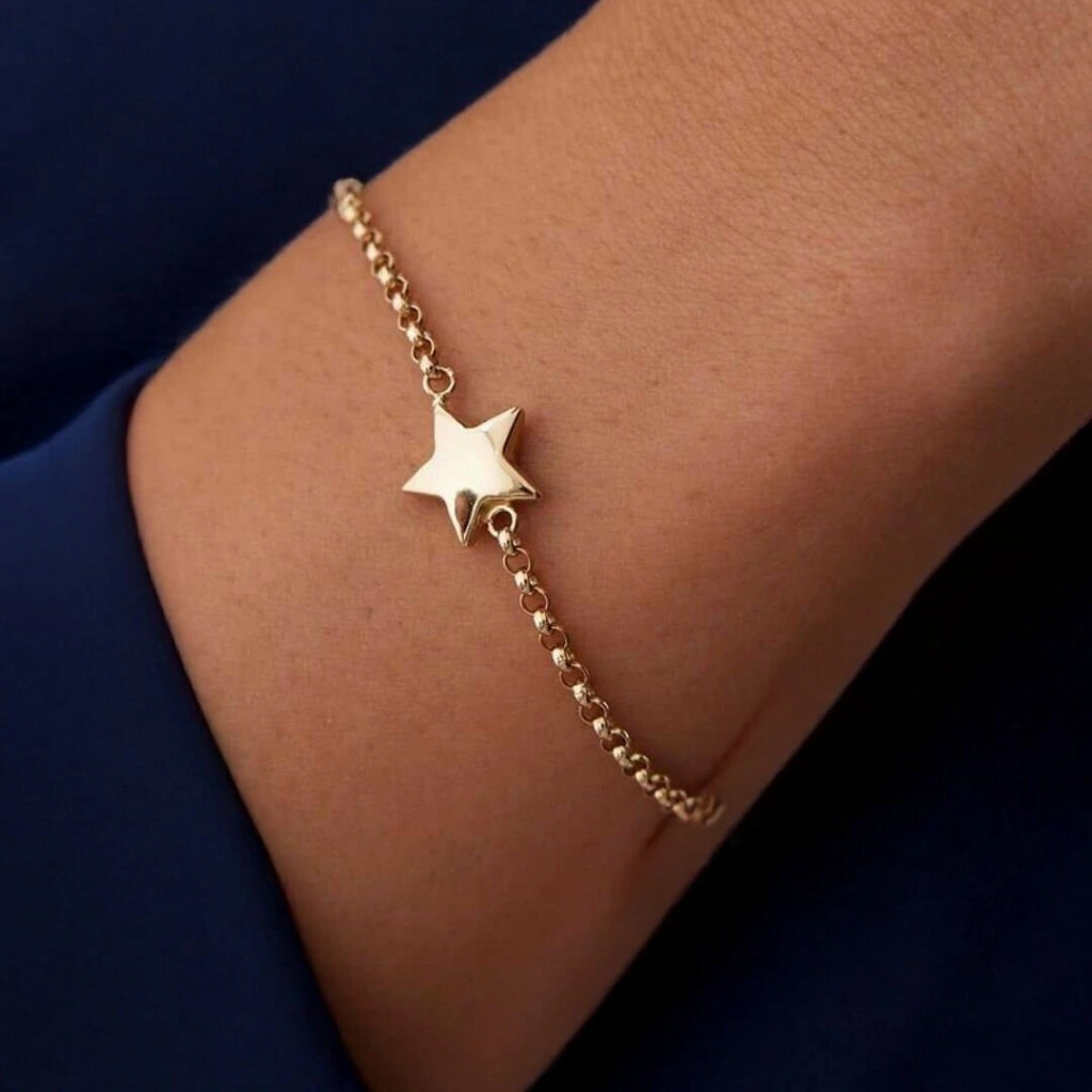 Altın Zincirli Yıldız Bileklik, zarif zincir yapısı ve yıldız motifiyle sade şıklığı bir araya getiriyor.