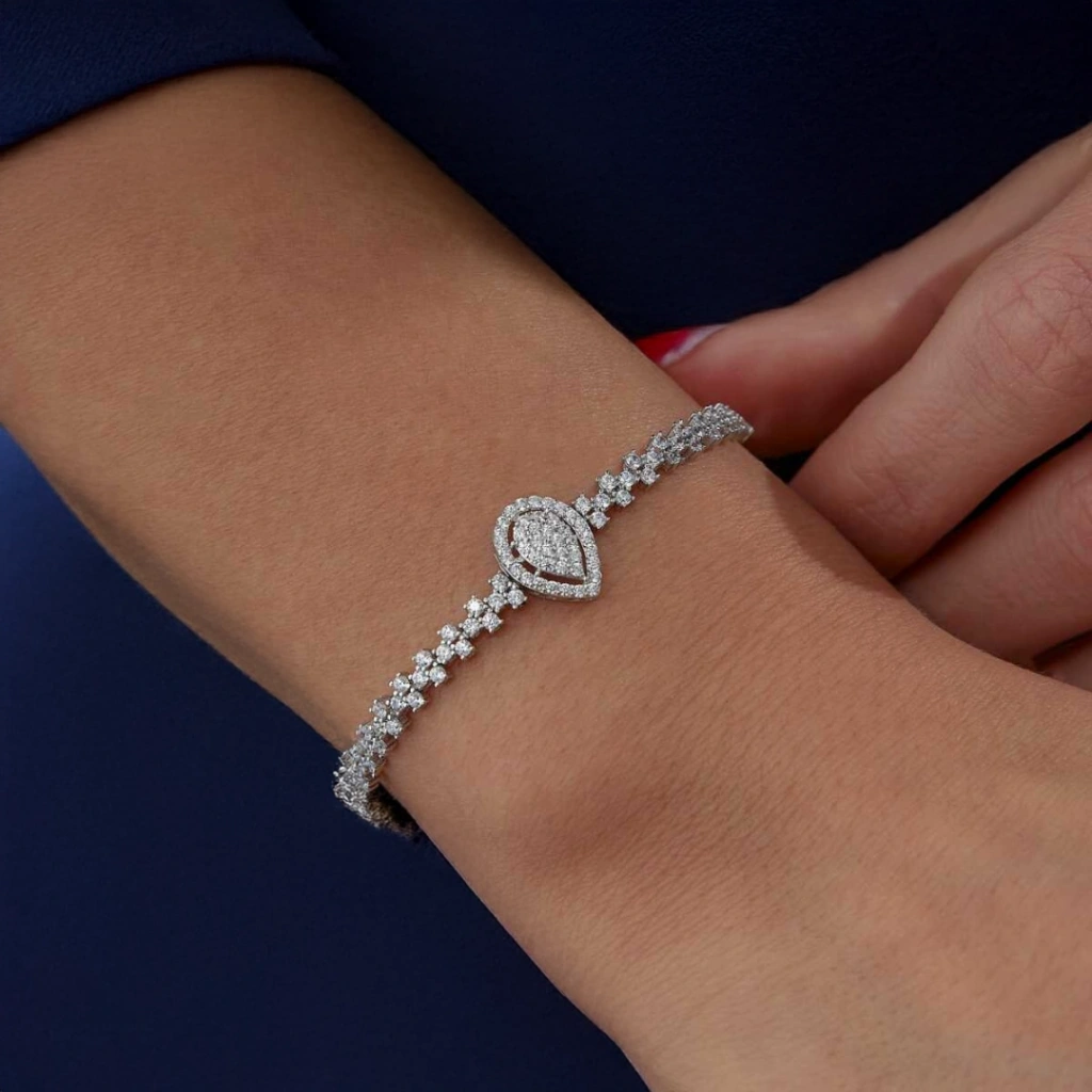 14 ayar beyaz altın ile hazırlanan bu set; kolye, bileklik ve küpe üçlüsüyle günlük kullanımda ve özel davetlerde stilinizi tamamlar.